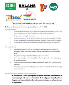 Motie evaluatie verkeersmaatregel Baroniestraat (D66,BALANS,VVD,CDA,INbox,PvdAGL)